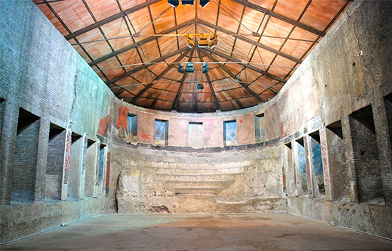 Intorno al 30 a.C., Mecenate, influente consigliere dell’imperatore Ottaviano Augusto, nonché protettore di artisti e poeti, fece costruire un grande complesso architettonico ai confini dell’Urbe, in corrispondenza con le Mura Serviane, la prima cinta muraria di cui si dotò la città. Ciò che rimane di questa splendida villa si trova in largo Leopardi, nel quartiere Esquilino, ed è conosciuto come l’Auditorium di Mecenate, uno dei più interessanti siti archeologici della capitale. In realtà si trattava di un antico e bellissimo ninfeo triclinio, una sala parzialmente interrata con giochi d’acqua, quindi più fresca, dove probabilmente si riunivano Mecenate con il suo circolo di poeti e intellettuali (da qui il termine mecenatismo), tra cui Orazio, Virgilio e Properzio. Sono diversi gli elementi a sostegno di questa ipotesi: le nicchie della sala e dell’abside decorate con scene di giardini con piante, fiori e uccelli per dare l’illusione di finestre aperte su spazi verdi; alcuni versi dell’epigramma del poeta greco Callimaco, rinvenuti dipinti sull’intonaco esterno, alludono agli effetti del vino e dell’amore; la presenza di tubi che uscivano dal gradino più alto della cavea, dai quali doveva scendere l’acqua a formare una cascatella.