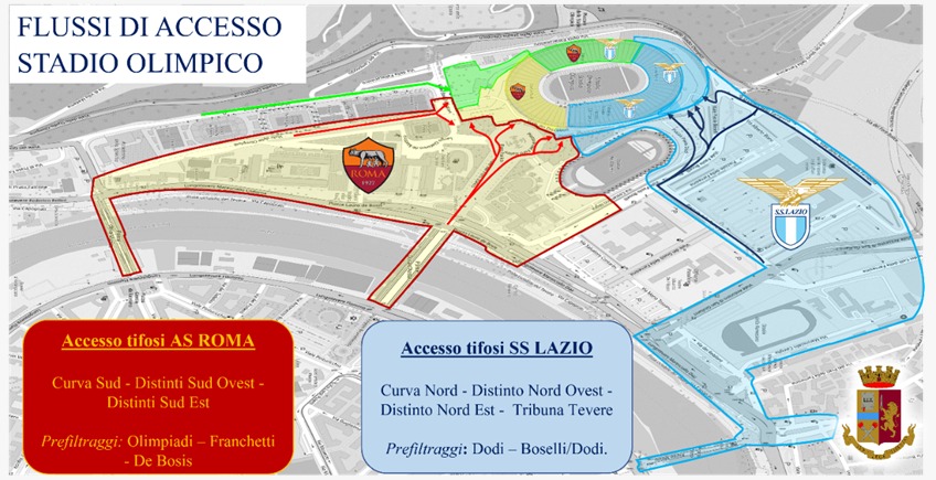 Il piano predisposto dalla Questura prevede, come di consueto, percorsi di afflusso dedicati per i sostenitori della S.S. Lazio e dell’ A.S. Roma.