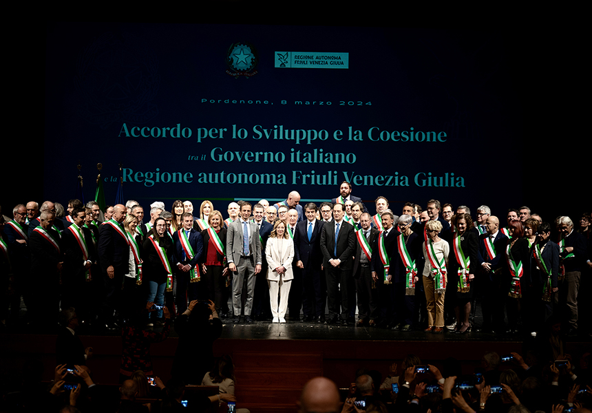 E’ stato firmato, al Teatro Verdi di Pordenone, dalla premier Giorgia Meloni e dal Presidente della Regione Friuli-Venezia Giulia, l’accordo sul Fondo per lo sviluppo e coesione, riguardante il contrasto al rischio idrogeologico, l’ammodernamento delle infrastrutture idriche, le scuole e la mobilità sostenibile.