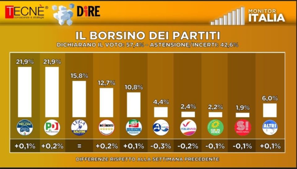 Il partito di Giorgia Meloni sale dello 0,1% e i democratici dello 0,2%, rispetto alla rilevazione della settimana scorsa. Fratelli d’Italia è il primo partito in Italia quanto a intenzioni di voto, ma è appaiato in vetta con il Pd al 21,9%. Il partito di Giorgia Meloni sale dello 0,1% e i democratici dello 0,2%, rispetto alla rilevazione della settimana scorsa.