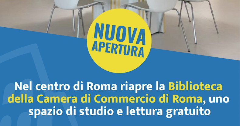 La biblioteca della Camera di Commercio di Roma, all’interno della storica sede istituzionale di Via de’ Burrò 147, è aperta al pubblico. Profondamente rinnovata e ammodernata nei suoi spazi, la biblioteca è pronta ad accogliere cittadini e studenti per offrire loro un ambiente ideale per lo studio e la ricerca. I locali sono aperti dal lunedì al venerdì, dalle 9 alle 19 (orario continuato), con la possibilità di effettuare ricerche o più semplicemente studiare sui propri testi, oltre a poter accedere gratuitamente alla rete wi-fi. Maggiori informazioni contattando i numeri 0652082560/2435/2597 oppure inviando una mail all’indirizzo biblioteca@rm.camcom.it.