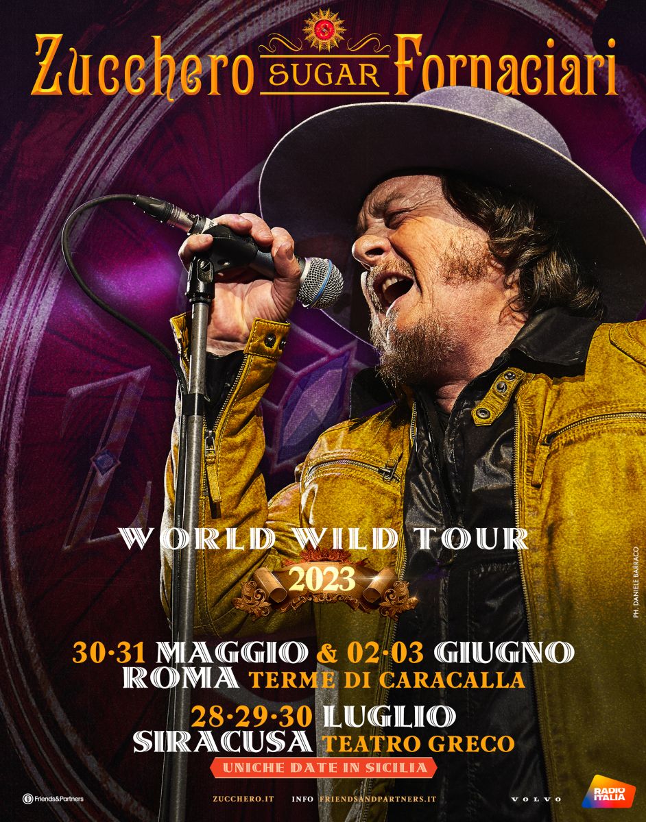 Partito da Caracalla il “World Wild Tour” di Zucchero “Sugar” Fornaciari: martedì 30, mercoledì 31 maggio, venerdì 2 giugno, sabato 3 giugno e domenica 4 giugno, poi 4-5 luglio in Piazza Unità d’Italia a Trieste, 24-25 luglio al Cortile della Reggia di Caserta, 28-29-30 luglio al Teatro Greco di Siracusa.