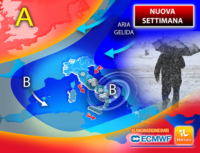 “L’irruzione di aria artica che raggiungerà la Penisola subito dopo la giornata di domenica, porterà un ulteriore calo delle temperature e potrà a tratti favorire qualche nevicata fino a bassa quota“. Lo scrivono i meteorologi di 3bmeteo.com. “Non sarà un evento eccezionale ma pienamente normale in un contesto che ha visto caldo anomalo sull’Italia fino a poco prima dell’Epifania. Il freddo interesserà prevalentemente il Nord e le regioni adriatiche, sarà più smorzato sulle regioni tirreniche e sulle Isole maggiori, dove è atteso un aumento termico tra mercoledì e giovedì. Tra venerdì e il weekend un nuovo impulso artico punterà l’Italia ma la sua traiettoria è ancora abbastanza controversa”. Nella giornata di lunedì avremo ancora a che fare con il vortice ciclonico ereditato dalla domenica che tenderà gradualmente a lasciare il meridione della Penisola. Il tempo sarà ancora molto instabile a tratti perturbato al Sud con piogge e temporali ma il minimo richiamerà verso le regioni adriatiche e settentrionali correnti fredde di estrazione continentale che potranno ancora ammassare delle nubi e portare delle precipitazioni. In particolare sono attesi dei fenomeni seppur deboli sul Piemonte, nevosi fino a 800/1000m e lungo la dorsale appenninica centro settentrionale a quote variabili tra 800 e 1200m. Altrove la nuvolosità sarà piuttosto sterile e poco foriera di fenomeni. Le temperature saranno in ulteriore lieve calo. Nella giornata di martedì il minimo di bassa pressione si sarà ormai definitivamente allontanato verso la Grecia e la Turchia quindi il tempo sarà essenzialmente governato dal flusso di correnti fredde che andrà a stimolare la formazione sul Mediterraneo occidentale di un nuovo vortice di bassa pressione. L’aria più mite richiamata da questo minimo potrà entrare in contrasto con l’aria fredda che ancora affluirà sull’Italia e produrre dell’instabilità. Qualche pioggia attesa ancora anche Sud e sulle Isole maggiori ma deboli fenomeni potranno interessare anche il Piemonte e la dorsale appenninica adriatica risultando nevosi fino a quote collinari. Tra mercoledì e giovedì l’Italia sarà ancora in parte influenzata dal flusso freddo ma che tenderà ad attenuarsi e contemporaneamente dalla depressione in avvicinamento dalla Spagna. Attese delle piogge sulle Isole maggiori e sulle regioni tirreniche ma qualche fenomeno sarà possibile anche al Nord e potrà risultare nevoso fino a bassa quota sul Piemonte. Le temperature tenderanno ad aumentare temporaneamente al Centro Sud mentre il freddo resisterà al Nord. Tra venerdì e sabato un nuovo impulso di aria artica punterà l’Italia ma la sua traiettoria è ancora molto incerta. Le previsioni deterministiche mostrano la saccatura più attiva al Sud con piogge e temporali soprattutto sulla Sicilia e neve in Appennino ma serviranno ulteriori analisi per avere una maggiore certezza.