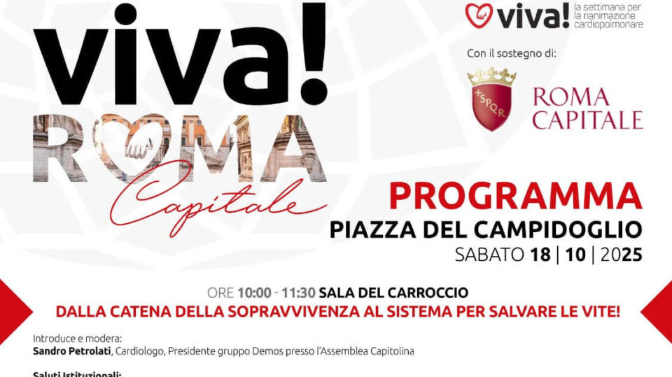 Nell’ambito della settimana “Viva” – iniziativa nazionale di Italian Resuscitation Council (IRC) per la rianimazione cardiopolmonare – si è svolta in Campidoglio una giornata evento promossa da IRC e Ares 118 con il sostegno di Roma Capitale, coordinata dal cardiologo e Presidente del Gruppo Demos in Assemblea Capitolina Sandro Petrolati.