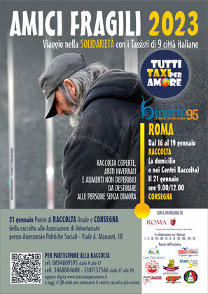 “Siamo davvero contenti e soddisfatti del successo di ‘Amici Fragili’ che – spiega il presidente dell’associazione Tutti Taxi per Amore-OdV Marco Salciccia – ogni anno cresce nella partecipazione di Istituzioni, enti del Terzo Settore e nel numero di tanti cittadini che vengono coinvolti e decidono di fare delle donazioni. Un impegno che, con spirito civico, contraddistingue molti tassisti e la nostra Associazione che con questa iniziativa vuole offrire il proprio contributo solidale a vantaggio delle categorie più fragili, sensibilizzando anche i cittadini alla cultura del riuso”. Si potranno donare: abbigliamento, prodotti di igiene personale, generi alimentari non deperibili, altri beni utili (scarpe, trolley, zaini, coperte e sacchi a pelo, asciugamani e teli da doccia). Dal 15 al 18 gennaio, dalle 09:00 alle 13:00 e dalle 17:00 alle 20:00 i tassisti di Tutti Taxi per Amore sono reperibili, anche per fornire informazioni sui punti di raccolta, ai seguenti numeri: 3396059080, 3387157566, 3338253771. Oppure è possibile consultare il sito www.tuttitaxiperamore.it