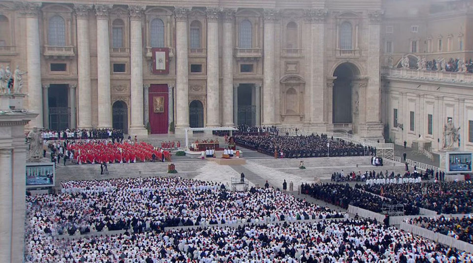 Alle 8.50 in punto, come da cerimoniale, la bara di cipresso con le spoglie del Papa emerito Benedetto XVI è stata trasportata dalla basilica sul sagrato dai sediarii, i Gentiluomini di Sua Santità. Dalla piazza, già piena, e dai cardinali, vescovi e sacerdoti presenti è partito subito un caloroso applauso, che si è ripetuto più volte, e in particolare quando mons. Georg Gänswein, segretario particolare del Papa emerito, ha adagiato e aperto il Vangelo sulla bara, deposta al centro del sagrato, e si è inginocchiato per baciarla. Poi la folla di fedeli ha cominciato a recitare il Rosario. Sullo sfondo, il suono delle campane a morto provenienti dalla basilica. Come detto la salma di Benedetto XVI è stata traslata alle 8.50 in punto dall’interno della Basilica di San Pietro al sagrato. Ad accompagnare il feretro, il segretario particolare del Papa emerito, l’arcivescovo Georg Gaenswein. Padre Georg ha posato il Vangelo aperto sulla bara, si è inginocchiato e l’ha baciata. Su richiesta espressa di Ratzinger, il corpo è stato adagiato in una triplice bara – una delle quali in legno di cipresso – in cui saranno collocate la medaglia e le monete coniate durante il Pontificato, il pallio o i palli del vescovo e il rogito, ossia un testo in cui è descritto brevemente il Pontificato. In particolare il rogito viene inserito in un tubo di metallo, come è stato chiarito dalla Sala Stampa della Santa Sede. Subito dopo è iniziata la recita del Santo Rosario. Ben prima delle 8 i posti a sedere allestiti all’interno del colonnato del Bernini sono andati lentamente esauriti per l’afflusso dei numerosissimi pellegrini, formati anche da gruppi giunti da tutta Italia ma soprattutto dal resto del mondo. Tra la folla, tante le lingue che si potevano cogliere: spagnolo, polacco, inglese, francese, portoghese, arabo, cinese e naturalmente tedesco, la lingua madre di Joseph Ratzinger.