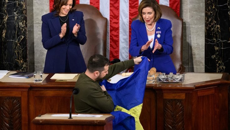 “Contro ogni probabilità, l’Ucraina non è caduta ma vive e combatte: non ci arrenderemo mai”. Con queste parole Volodymyr Zelensky si è rivolto al Congresso americano durante la sua storica visita a Washington, primo viaggio all’estero dall’inizio della guerra. Visibilmente emozionato e interrotto più volte dagli applausi, il presidente ucraino ha voluto “ringraziare gli americani”, ricordando loro che possono “velocizzare la nostra vittoria” riferendosi indirettamente agli aiuti che sono in corso di valutazione e che incontrano lo scetticismo di alcuni repubblicani. “Abbiamo l’artiglieria, grazie. È abbastanza? Onestamente no”, aggiunge, sottolineando che gli aiuti concessi a Kiev “non sono beneficienza ma un investimento nella sicurezza globale e nella democrazia”. Nonostante qualche defezione tra i Repubblicani, l’aula della Camera era gremita di rappresentanti e senatori di entrambi i partiti. Presente tutto il governo e qualche rappresentante dell’Intelligence americana. Una seduta così simbolicamente unita in nome della sicurezza non si vedeva dai tempi dell’attacco terroristico agli Usa dell’11 settembre 2001. Terminata la sua visita a Wasghinton, non è escluso che il presidente ucraino prossimamente possa visitare anche Regno Unito e, forse, Francia e Germania, secondo quanto riporta la Cbs. Zelensky al Congresso americano parla della Russia come di uno “stato terrorista” che va ritenuto responsabile per la guerra: Mosca potrebbe fermare l’aggressione “se volesse”. Poi lancia un messaggio anche ai russi che, a suo avviso, saranno liberi “solo quando sconfiggeranno il Cremlino nelle loro menti. La tirannia russa ha perso il controllo su di noi. La lotta continua e dobbiamo sconfiggere il Cremlino sul campo di battaglia”. Il presidente ucraino quindi cita la Seconda guerra mondiale, l’offensiva delle Ardenne e Franklyn Delano Roosevelt per spiegare la resilienza del suo popolo e ringraziare gli americani. “La vittoria dell’Ucraina sarà anche la vittoria dell’America”, osserva, menzionando la sua proposta di una formula di pace già presentata al G20. “Fra pochi giorni è Natale. In Ucraina lo celebreremo anche al lume di candela, e non per romanticismo. Non abbiamo l’elettricità e molti non hanno l’acqua. Ma non ci lamentiamo. La luce della nostra fede illuminerà il Natale”, osserva Zelensky ribadendo che quello che milioni di ucraini si augurano in questo momento è “la vittoria, solo la vittoria”. Il presidente quindi augura a tutti “buon Natale e un buon anno nuovo vittorioso”, prima di regalare al Congresso una bandiera ucraina che sbandierava a Bakhumt firmata dalle forse di Kiev. “Questa battaglia non può essere congelata o rinviata. Non può essere ignorata, sperando che l’oceano o qualcos’altro ci garantisca protezione. Dagli Stati Uniti alla Cina, dall’Europa all’America Latina, e da ogni angolo dell’Australia, il mondo è troppo interconnesso e indipendente per permettere a qualcuno di mettersi da parte e allo stesso tempo di sentirsi al sicuro quando una battaglia del genere continua”. E riconosce agli Stati Uniti la capacità di aver unito l’Europa contro l’aggressione russa: “L’Europa ora è più forte e più indipendente che mai”. Zelensky poi sottolinea i valori condivisi tra Stati Uniti e Ucraina: “Le nostre nazioni sono alleate in questa battaglia. E il prossimo anno diventerà un punto di svolta, il punto in cui il coraggio ucraino e la determinazione americana dovranno garantire il futuro della nostra comune libertà. La libertà del popolo che difende i propri valori”.